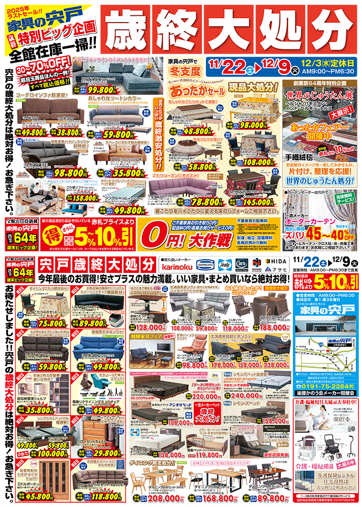 2025年11月22日(土)〜12月9日(火) 2025年ラストセール!!全館在庫一掃!!歳終大処分を開催いたします。 今年最後のお買得!安さプラスの魅力満載。いい家具・まとめ買いなら絶対お得!